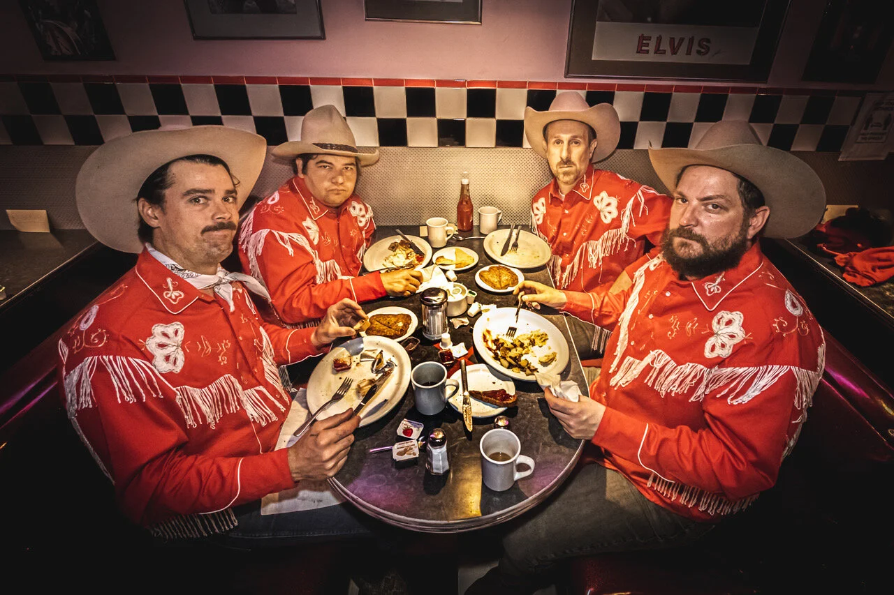 They all got together for their first jam and have been inseparable since that moment. The group had been holed up in the cabin that they’d been squattin’ in for almost a year when a bedraggled prospector by the name of Richard Nightman came knockin’ on their door. They couldn’t believe it, the man could play the gold pan better than any drummer they’d ever heard.